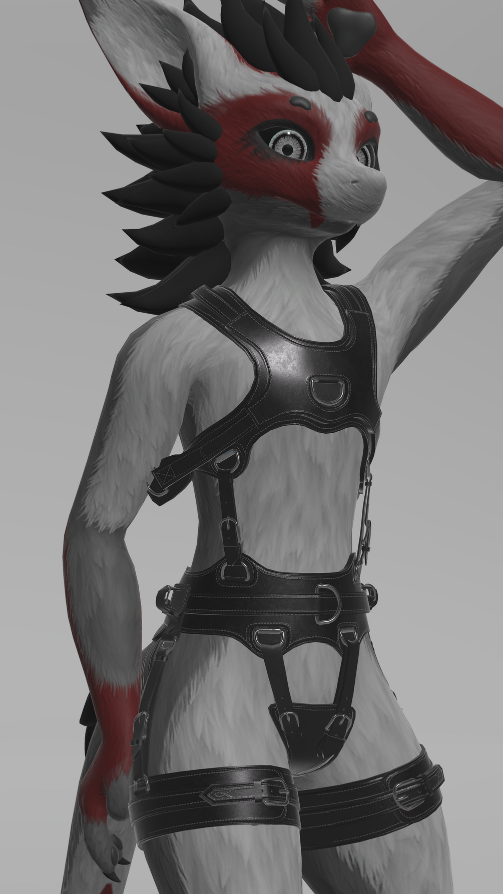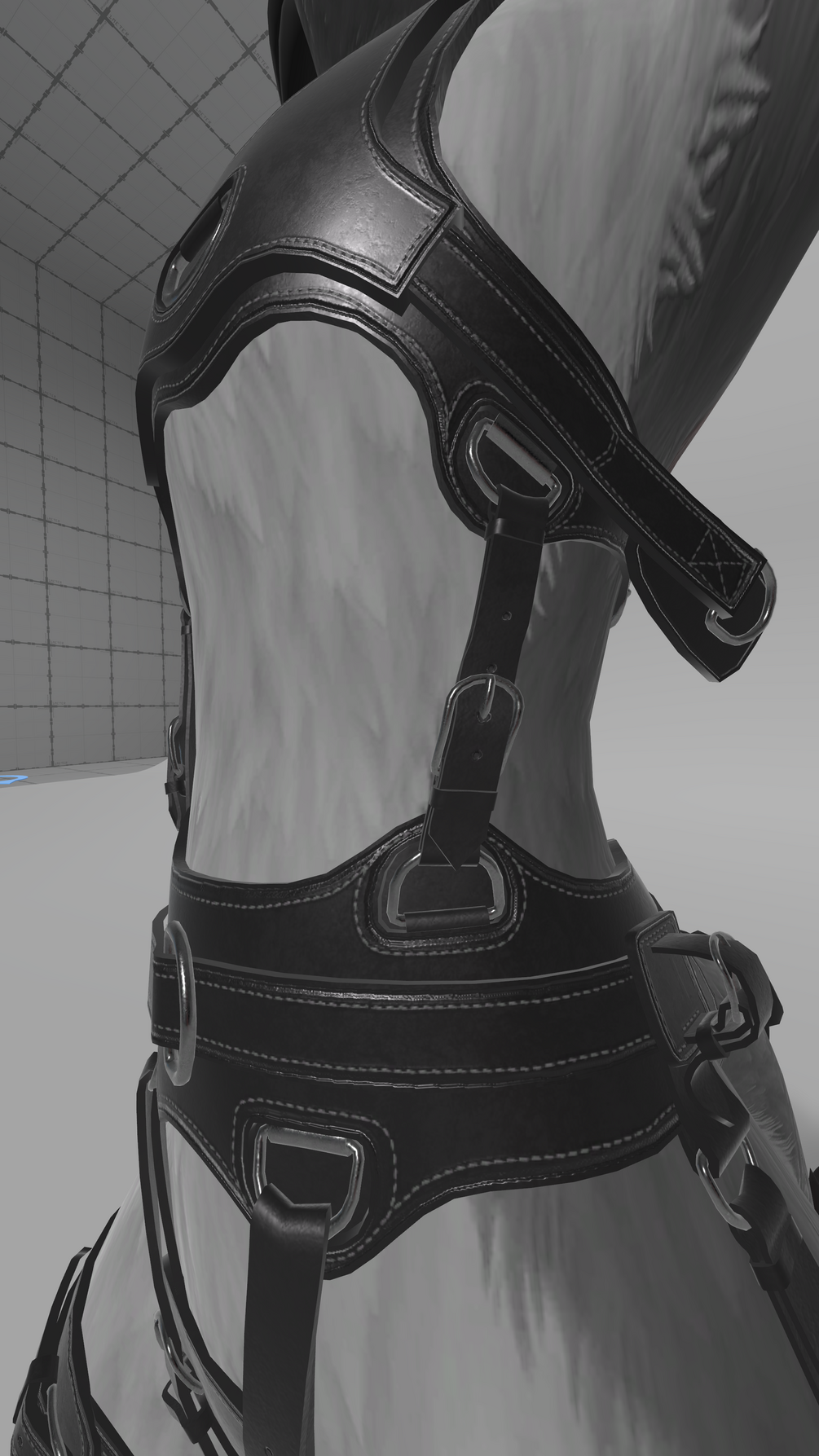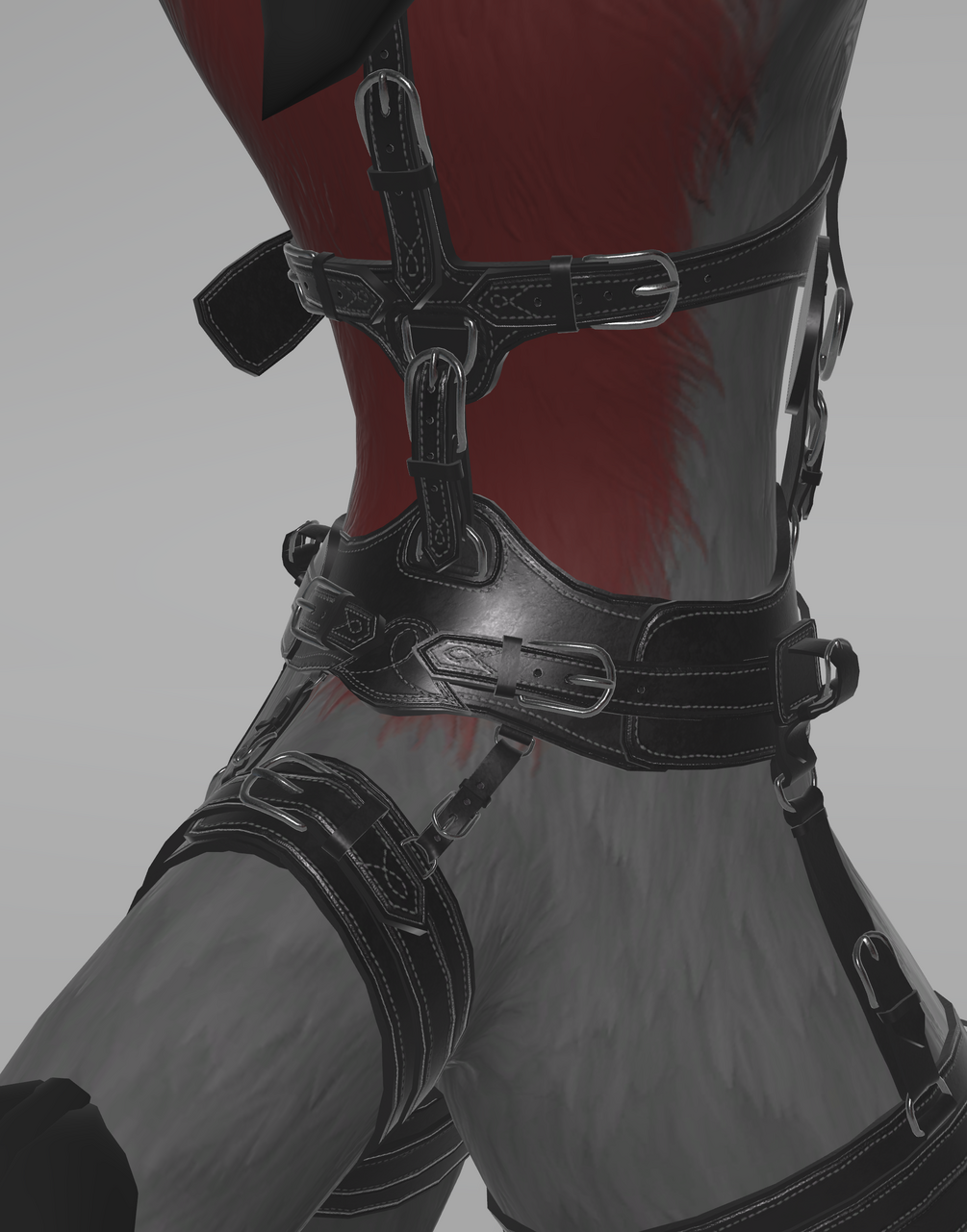 Heavy, multilayered Leather Pony Harness for the Nardoragon VR avatar. Each segment is modular for independent use.