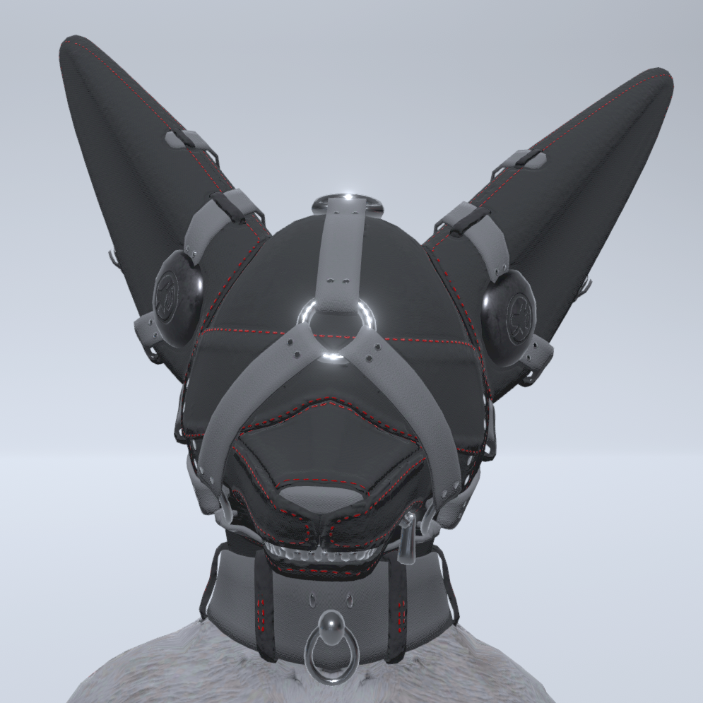 heavy duty full coverage hood for the Rexouium Vrchat avatar with clip on zip up muzzle, blindfold and deafening ear covers.